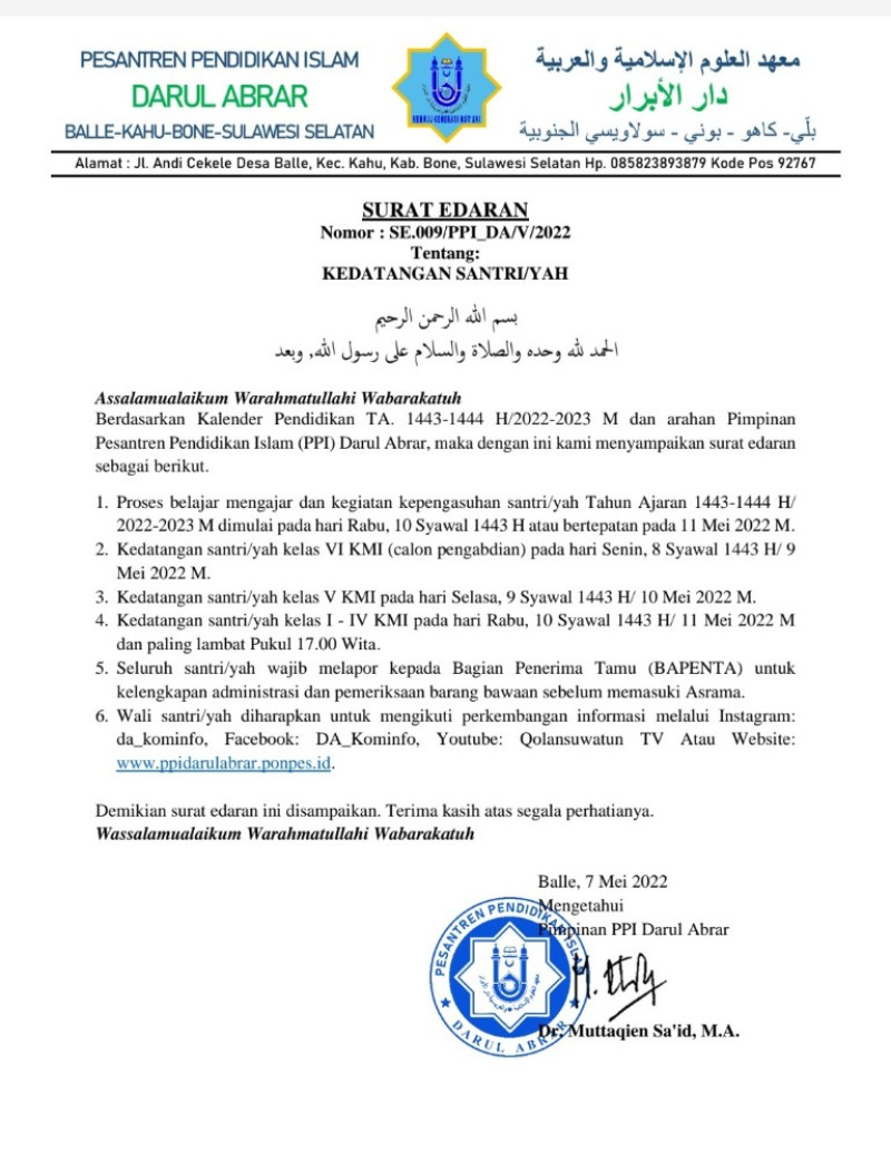Berdasarkan Kalender Pendidikan TA. 1443-1444 H/2022-2023 M dan arahan Pimpinan Pesantren Pendidikan Islam (PPI) Darul Abrar, maka dengan ini kami menyampaikan surat edaran sebagai berikut.